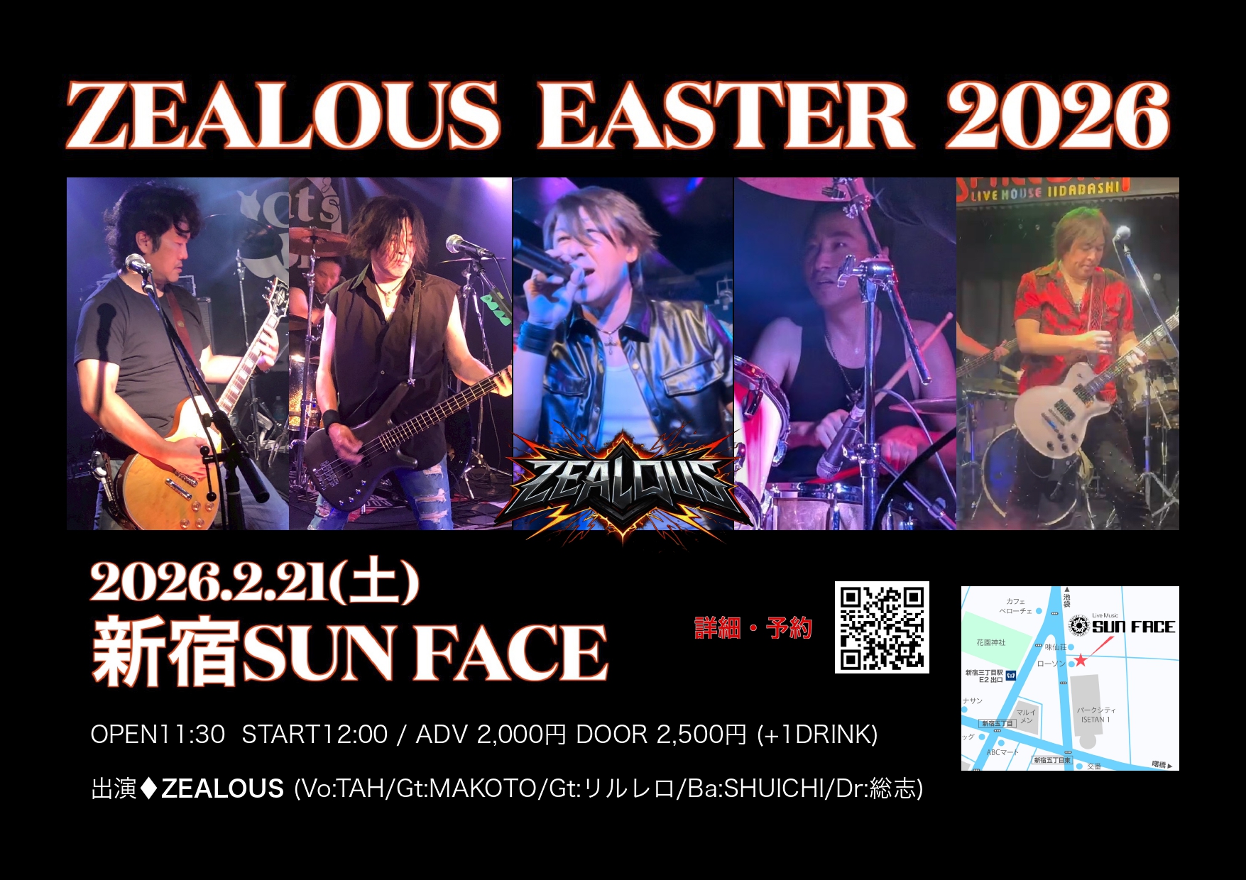 02.21Sat ZEALOUS Easter2026 OPEN 11:30/START 12:00 Ticket 前売¥2,000+1D(¥500)/当日¥2,500+1D(¥500) Act ZEALOUS
