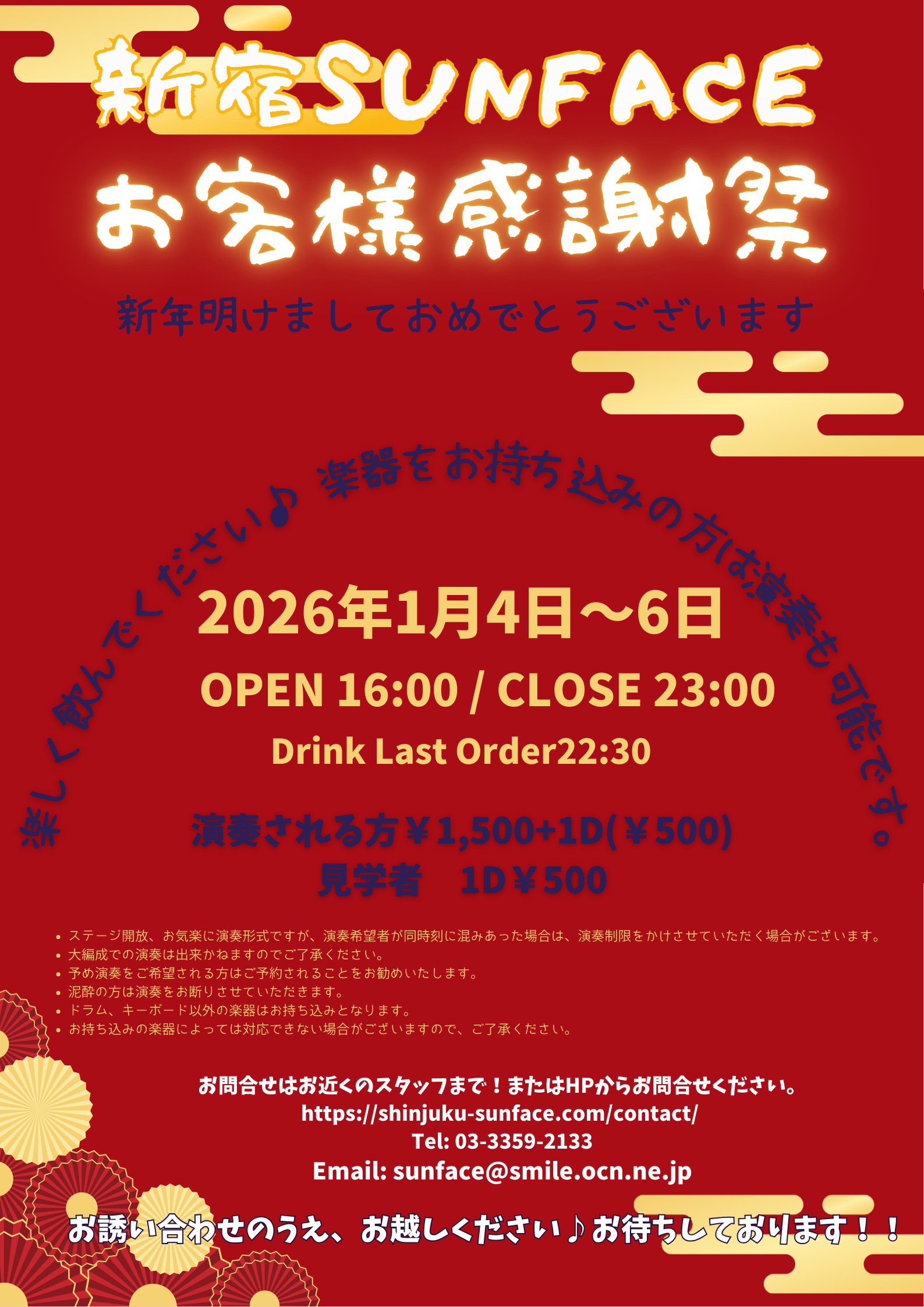 明けましておめでとうござます。 本年もどうぞよろしくお願いいたします。 お正月の4日~6日までお客様感謝祭を開催いたします。 OPEN16:00 ※演奏を希望される方は、事前にご連絡ください。